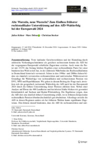 Kölzer, Julius ; Debus, Marc ORCID: 0000-0002-7151-7942 ; Stecker, Christian (2025) Alte Wurzeln, neue Wurzeln? Zum Einfluss früherer rechtsradikaler Unterstützung auf den AfD-Wahlerfolg bei der Europawahl 2024. Open Access Politische Vierteljahresschrift : PVS Wiesbaden ; Baden-Baden 66 4 847-865 [Zeitschriftenartikel]