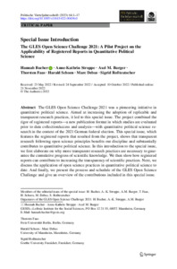 Special issue introduction. The GLES Open Science Challenge 2021: A pilot project on the applicability of registered reports in quantitative political scienceBucher, Hannah ; Stroppe, Anne-Kathrin ; Burger, Axel M. ; Faas, Thorsten ; Schoen, Harald ; Debus, Marc ; Roßteutscher, Sigrid