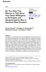 Do you have two minutes to talk about your data? Willingness to participate and nonparticipation bias in Facebook data donationKeusch, Florian ; Pankowska, Paulina K. ; Cernat, Alexandru ; Bach, Ruben L.