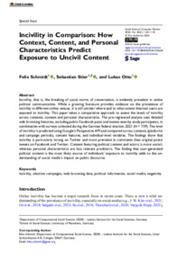 Incivility in comparison: how context, content, and personal characteristics predict exposure to uncivil contentSchmidt, Felix ; Stier, Sebastian ; Otto, Lukas