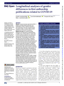 Longitudinal analyses of gender differences in first authorship publications related to COVID-19.