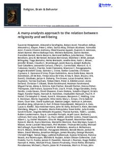 Hoogeveen, Suzanne ; Sarafoglou, Alexandra ; Aczel, Balazs ; Aditya, Yonathan ; Alayan, Alexandra J. ; Allen, Peter J. ; Altay, Sacha ; Alzahawi, Shilaan ; Amir, Yulmaida ; Anthony, Francis-Vincent ; Appiah, Obed Kwame ; Atkinson, Quentin D. ; Baimel, Adam ; Balkaya-Ince, Merve ; Balsamo, Michela ; Banker, Sachin ; Bartoš, František ; Becerra, Mario ; Beffara, Bertrand ; Beitner, Julia ; Bendixen, Theiss ; Berkessel, Jana ; Berniūnas, Renatas ; Billet, Matthew I. ; Billingsley, Joseph ; Bortolini, Tiago ; Breitsohl, Heiko ; Bret, Amélie ; Brown, Faith L. ; Brown, Jennifer ; Brumbaugh, Claudia C. ; Buczny, Jacek ; Bulbulia, Joseph ; Caballero, Saúl ; Carlucci, Leonardo ; Carmichael, Cheryl L. ; Cattaneo, Marco E. G. V. ; Charles, Sarah J. ; Claessens, Scott ; Panagopoulos, Maxinne C. ; Costa, Angelo Brandelli ; Crone, Damien L. ; Czoschke, Stefan ; Czymara, Christian ; D'Urso, E. Damiano ; Dahlström, Örjan ; Dalla Rosa, Anna ; Danielsson, Henrik ; De Ron, Jill ; de Vries, Ymkje Anna ; Dean, Kristy K. ; Dik, Bryan J. ; Disabato, David J. ; Doherty, Jaclyn K. ; Draws, Tim ; Drouhot, Lucas ; Dujmovic, Marin ; Dunham, Yarrow ; Ebert, Tobias ; Edelsbrunner, Peter A. ; Eerland, Anita ; Elbaek, Christian T. ; Farahmand, Shole ; Farahmand, Hooman ; Farias, Miguel ; Feliccia, Abrey A. ; Fischer, Kyle ; Fischer, Ronald ; Fisher-Thompson, Donna ; Francis, Zoë ; Frick, Susanne ; Frisch, Lisa K. ; Geraldes, Diogo ; Gerdin, Emily ; Geven, Linda ; Ghasemi, Omid ; Gielens, Erwin ; Gligorić, Vukašin ; Hagel, Kristin ; Hajdu, Nandor ; Hamilton, Hannah R. ; Hamzah, Imaduddin ; Hanel, Paul H. P. ; Hawk, Christopher E. ; Himawan, Karel K. ; Holding, Benjamin C. ; Homman, Lina E. ; Ingendahl, Moritz ORCID: 0000-0002-2124-0754 ; Inkilä, Hilla ; Inman, Mary L. ; Islam, Chris-Gabriel ; Isler, Ozan ; Izydorczyk, David ORCID: 0000-0002-8792-0795 ; Jaeger, Bastian ; Johnson, Kathryn A. ; Jong, Jonathan ; Karl, Johannes A. ; Kaszubowski, Erikson ; Katz, Benjamin A. ; Keefer, Lucas A. ; Kelchtermans, Stijn ; Kelly, John M. ; Klein, Richard A. ; Kleinberg, Bennett ; Knowles, Megan L. ; Kołczyńska, Marta ; Koller, Dave ; Krasko, Julia ; Kritzler, Sarah ; Krypotos, Angelos-Miltiadis ; Kyritsis, Thanos ; Landes, Todd L. ; Laukenmann, Ruben ; Forsyth, Guy A. Lavender ; Lazar, Aryeh ; Lehman, Barbara J. ; Levy, Neil ; Lo, Ronda F. ; Lodder, Paul ; Lorenz, Jennifer ; Łowicki, Paweł ; Ly, Albert L. ; Maassen, Esther ; Magyar-Russell, Gina M. ; Maier, Maximilian ; Marsh, Dylan R. ; Martinez, Nuria ; Martinie, Marcellin ; Martoyo, Ihan ; Mason, Susan E. ; Mauritsen, Anne Lundahl ; McAleer, Phil ; McCauley, Thomas ; McCullough, Michael ; McKay, Ryan ; McMahon, Camilla M. ; McNamara, Amelia A. ; Means, Kira K. ; Mercier, Brett ; Mitkidis, Panagiotis ; Monin, Benoît ; Moon, Jordan W. ; Moreau, David ; Morgan, Jonathan ; Murphy, James ; Muscatt, George ; Nägel, Christof ; Nagy, Tamás ; Nalborczyk, Ladislas ; Nilsonne, Gustav ; Noack, Pamina ; Norenzayan, Ara ; Nuijten, Michèle B. ; Olsson-Collentine, Anton ; Oviedo, Lluis ; Pavlov, Yuri G. ; Pawelski, James O. ; Pearson, Hannah I. ; Pedder, Hugo ; Peetz, Hannah K. ; Pinus, Michael ; Pirutinsky, Steven ; Polito, Vince ; Porubanova, Michaela ; Poulin, Michael J. ; Prenoveau, Jason M. ; Prince, Mark A. ; Protzko, John ; Pryor, Campbell ; Purzycki, Benjamin G. ; Qiu, Lin ; Pütter, Julian Quevedo ; Rabelo, André ; Radell, Milen L. ; Ramsay, Jonathan E. ; Reid, Graham ; Roberts, Andrew J. ; Root Luna, Lindsey M. ; Ross, Robert M. ; Roszak, Piotr ; Roy, Nirmal ; Saarelainen, Suvi-Maria K. ; Sasaki, Joni Y. ; Schaumans, Catherine ; Schivinski, Bruno ; Schmitt, Marcel C. ; Schnitker, Sarah A. ; Schnuerch, Martin ORCID: 0000-0001-6531-2265 ; Schreiner, Marcel Raphael ; Schüttengruber, Victoria ; Sebben, Simone ; Segerstrom, Suzanne C. ; Seryczyńska, Berenika ; Shjoedt, Uffe ; Simsek, Müge ; Sleegers, Willem W. A. ; Smith, Eliot R. ; Sowden, Walter J. ; Späth, Marion ; Spörlein, Christoph ; Stedden, William ; Stoevenbelt, Andrea H. ; Stuber, Simon ; Sulik, Justin ; Suwartono, Christiany ; Syropoulos, Stylianos ; Szaszi, Barnabas ; Szecsi, Peter ; Tappin, Ben M. ; Tay, Louis ; Thibault, Robert T. ; Thompson, Burt ; Thurn, Christian M. ; Torralba, Josefa ; Tuthill, Shelby D. ; Ullein, Ann-Marie ; Van Aert, Robbie C. M. ; van Assen, Marcel A. L. M. ; Van Cappellen, Patty ; van den Akker, Olmo R. ; Van der Cruyssen, Ine ; Van der Noll, Jolanda ; van Dongen, Noah N. N. ; Van Lissa, Caspar J. ; van Mulukom, Valerie ; van Ravenzwaaij, Don ; van Zyl, Casper J. J. ; Vaughn, Leigh Ann ; Većkalov, Bojana ORCID: 0000-0002-8477-1261 ; Verschuere, Bruno ; Vianello, Michelangelo ; Vilanova, Felipe ; Vishkin, Allon ; Vogel, Vera ; Vogelsmeier, Leonie V. D. E. ; Watanabe, Shoko ; White, Cindel J. M. ; Wiebels, Kristina ; Wiechert, Sera ; Willett, Zachary Z. ; Witkowiak, Maciej ; Witvliet, Charlotte V. O. ; Wiwad, Dylan ; Wuyts, Robin ; Xygalatas, Dimitris ; Yang, Xin ; Yeo, Darren J. ; Yilmaz, Onurcan ; Zarzeczna, Natalia ; Zhao, Yitong ; Zijlmans, Josjan ; van Elk, Michiel ; Wagenmakers, Eric-Jan (2023) A many-analysts approach to the relation between religiosity and well-being. Open Access Religion, Brain & Behavior Abingdon ; London 13 3 1-50 [Zeitschriftenartikel]