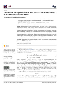 The weak convergence rate of two semi-exact discretization schemes for the Heston model.