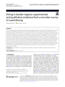 Gutfleisch, Tamara ; Samuel, Robin (2022) Hiring in border regions: experimental and qualitative evidence from a recruiter survey in Luxembourg. Open Access Journal for Labour Market Research = Zeitschrift für Arbeitsmarktforschung Berlin ; Heidelberg 56 Article 21 1-13 [Zeitschriftenartikel]