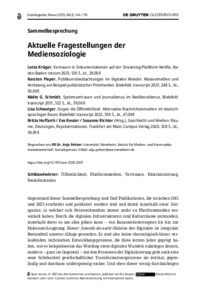 Aktuelle Fragestellungen der Mediensoziologie : Lotta Krüger, Vertrauen in Dokumentationen auf der Streaming-Plattform Netflix. Baden-Baden: tectum 2023, 126 S., kt., 29,00 € Karsten Pieper, Publikumsbeobachtungen im digitalen Wandel. Massenmedien und Verdatung am Beispiel publizistischer Printmedien. Bielefeld: transcript 2023, 248 S., kt., 50,00 € Malte G. Schmidt, Systemvertrauen und Journalismus im Neoliberalismus. Bielefeld: transcript 2021, 322 S., kt., 39,00 € Lisa Schwaiger, Gegen die Öffentlichkeit. Alternative Nachrichtenmedien im deutschsprachigen Raum. Bielefeld: transcript 2022, 330 S., kt., 47,00 € Britta Hoffarth / Eva Reuter / Susanne Richter (Hrsg.), Geschlecht und Medien: Räume, Deutungen, Repräsentationen. Frankfurt am Main: Campus Verlag 2020, 328 S., kt., 34,95 €.